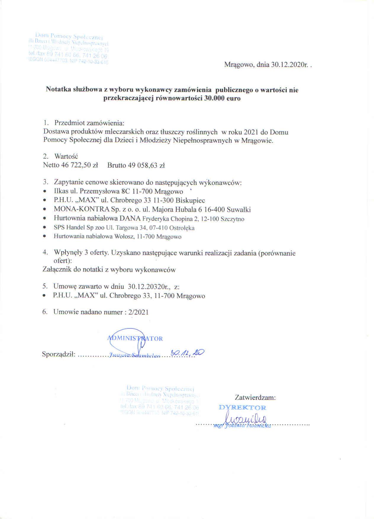 Dom Pomocy Społecznej dla Dzieci i Młodzieży Niepełnosprawnych w Mrągowie zawiadamia, o wyborze najkorzystniejszej oferty na dostawy nabiału w roku 2021r.