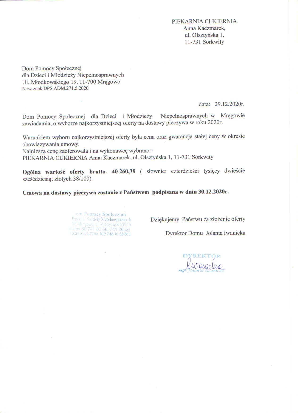 Dom Pomocy Społecznej dla Dzieci i Młodzieży Niepełnosprawnych w Mrągowie zawiadamia, o wyborze najkorzystniejszej oferty na dostawy pieczywa w roku 2020r.