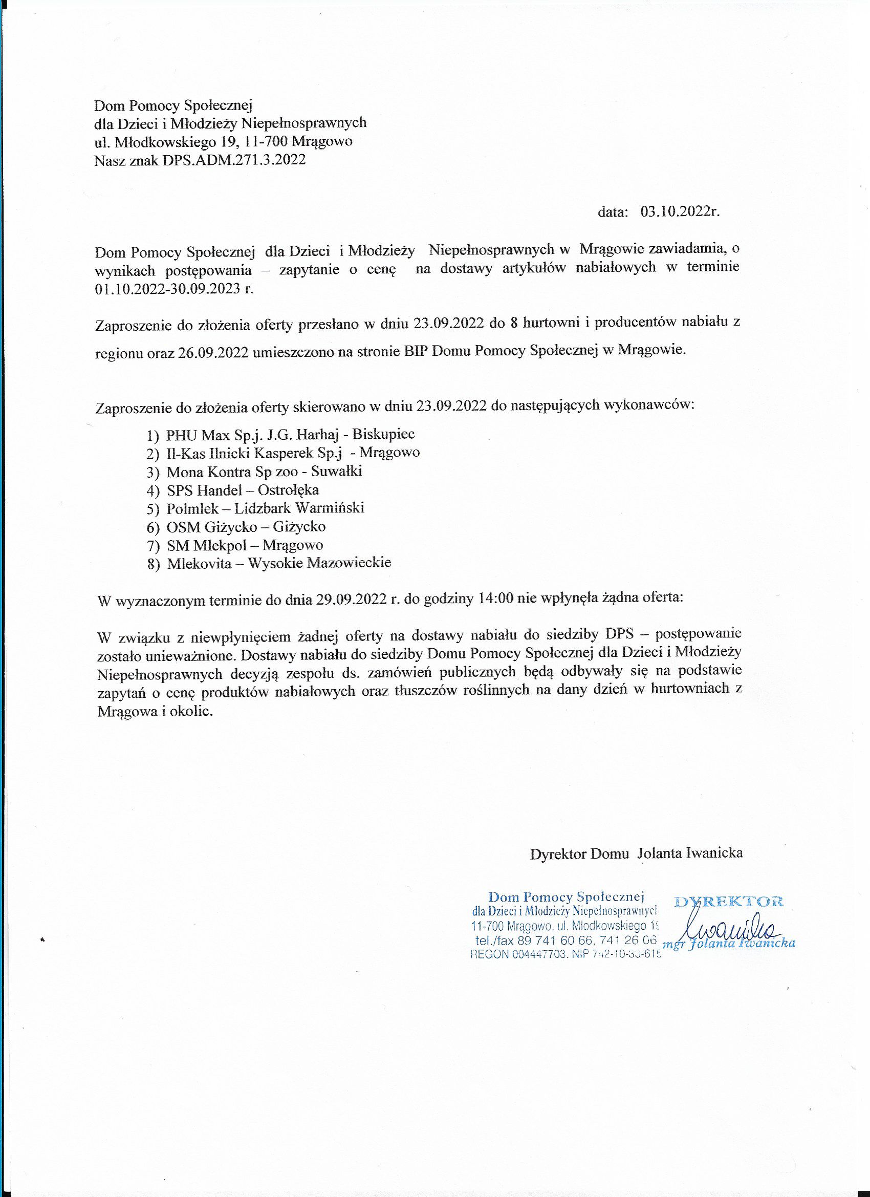 Dom Pomocy Społecznej dla Dzieci i Młodzieży Niepełnosprawnych w Mrągowie zawiadamia, o wyborze najkorzystniejszej oferty na dostawy artykułów nabiałowych w terminie 01.01.2022-31.12.2022 r.