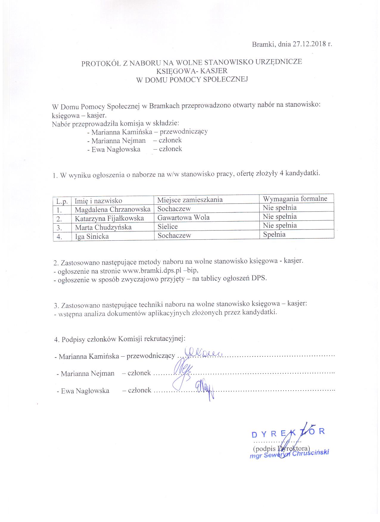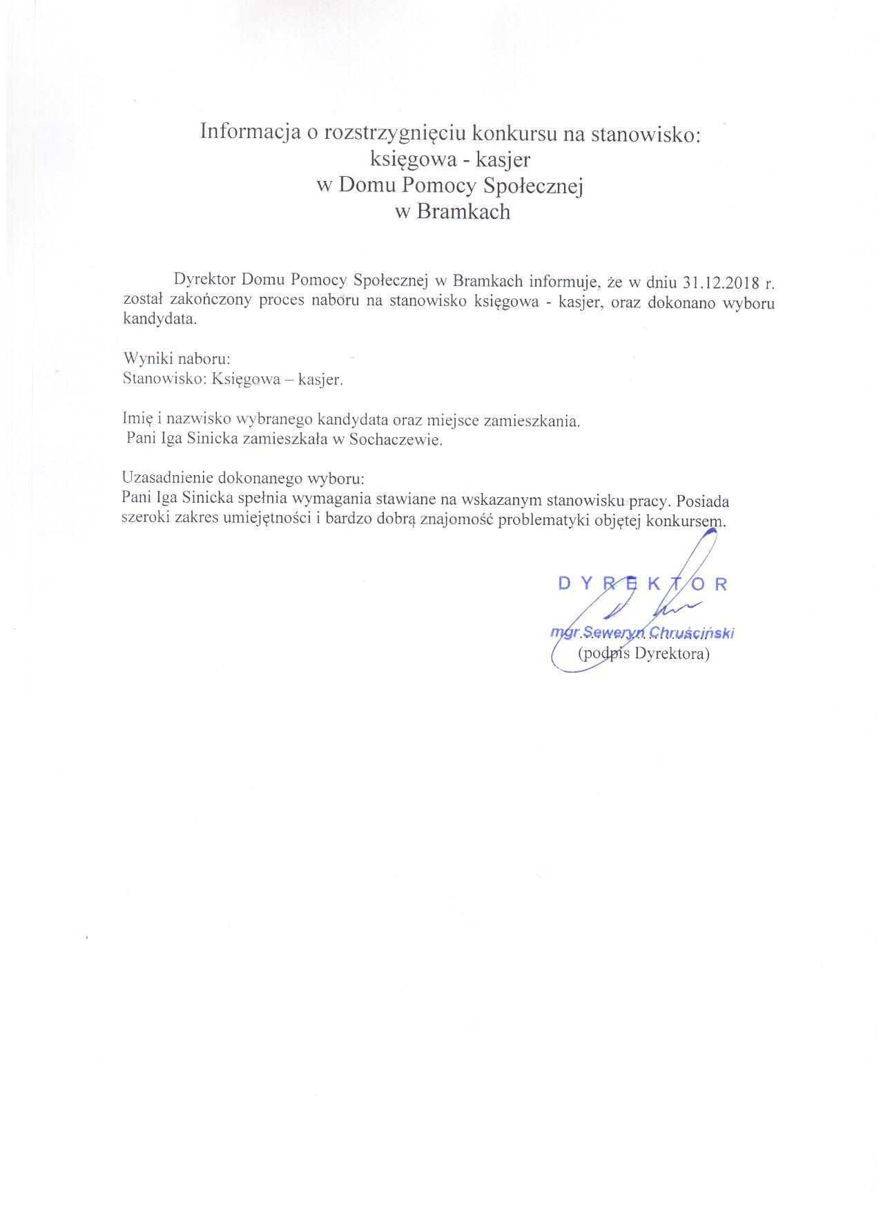 W załączniku Informacja o rozstrzygnięciu konkursu na stanowisko: ksiegowa-kasjerw Domu Pomocy Społecznej w Bramkach