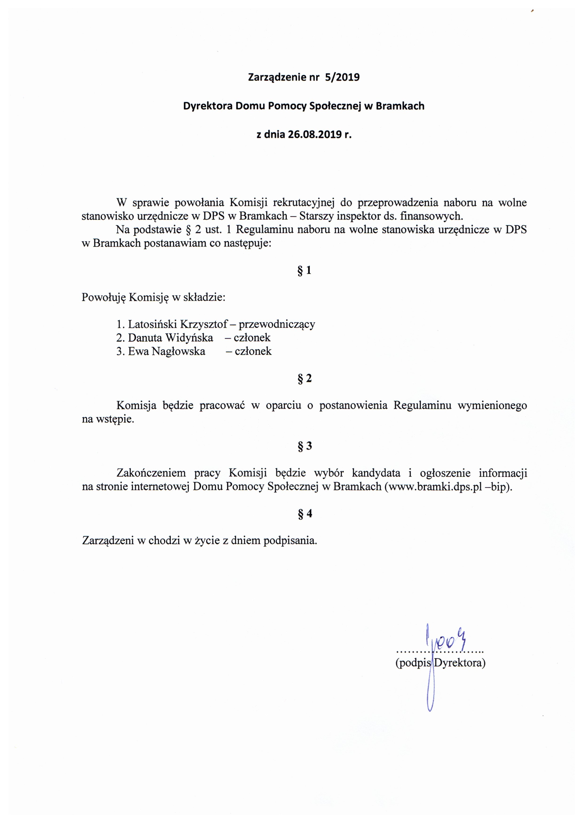 W załączniku Informacja o rozstrzygnięciu konkursu na stanowisko: Inspektor ds. finansowych Domu Pomocy Społecznej w Bramkach