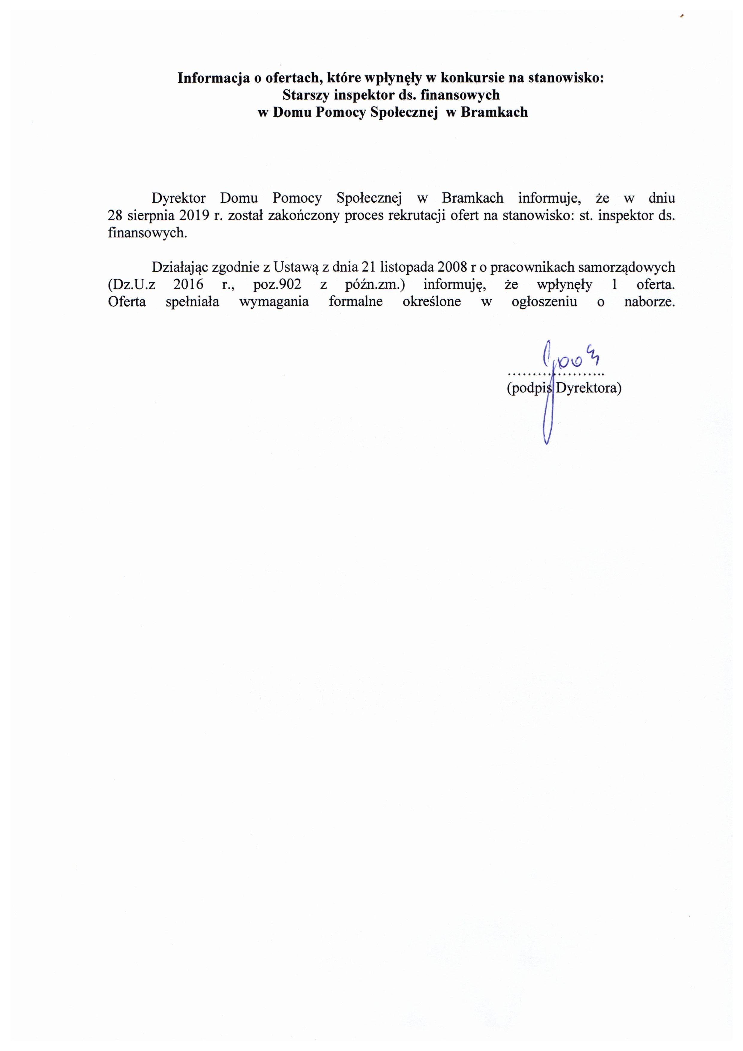 Informujemy że w dniu 29.08.2019 r. został zakończony proces naboru na stanowisko: st. inspektor ds. finansowych w DPS Bramki oraz dokonano wyboru kandydata.