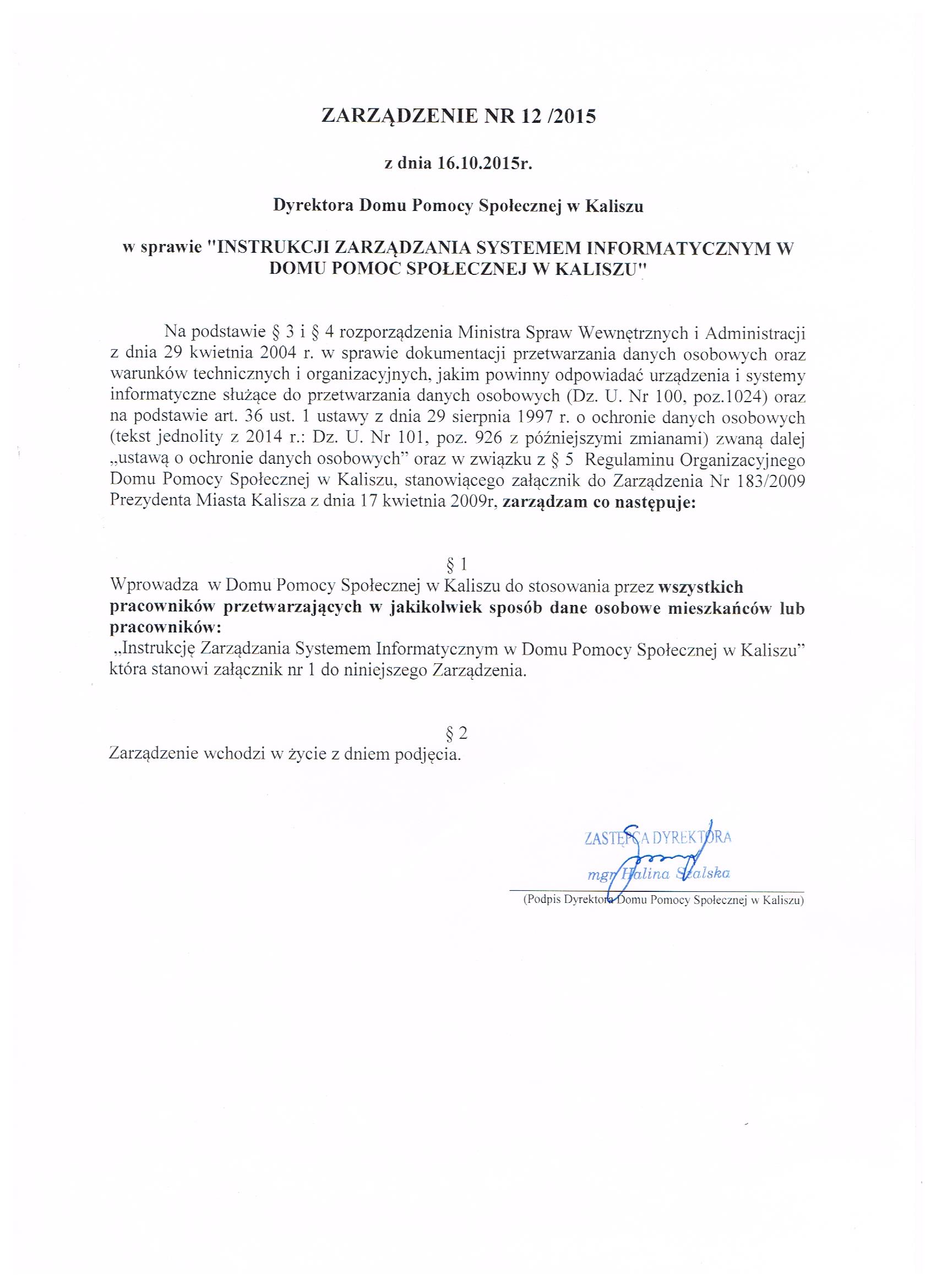 Zarządzenie Nr 12/2015 Dyrektora Domu Pomocy Społecznej w Kaliszu z dnia 16.10.2015r w sprawie "Instrukcji zarządzania systemem informatycznym w Domu Pomocy Społecznej w Kaliszu"