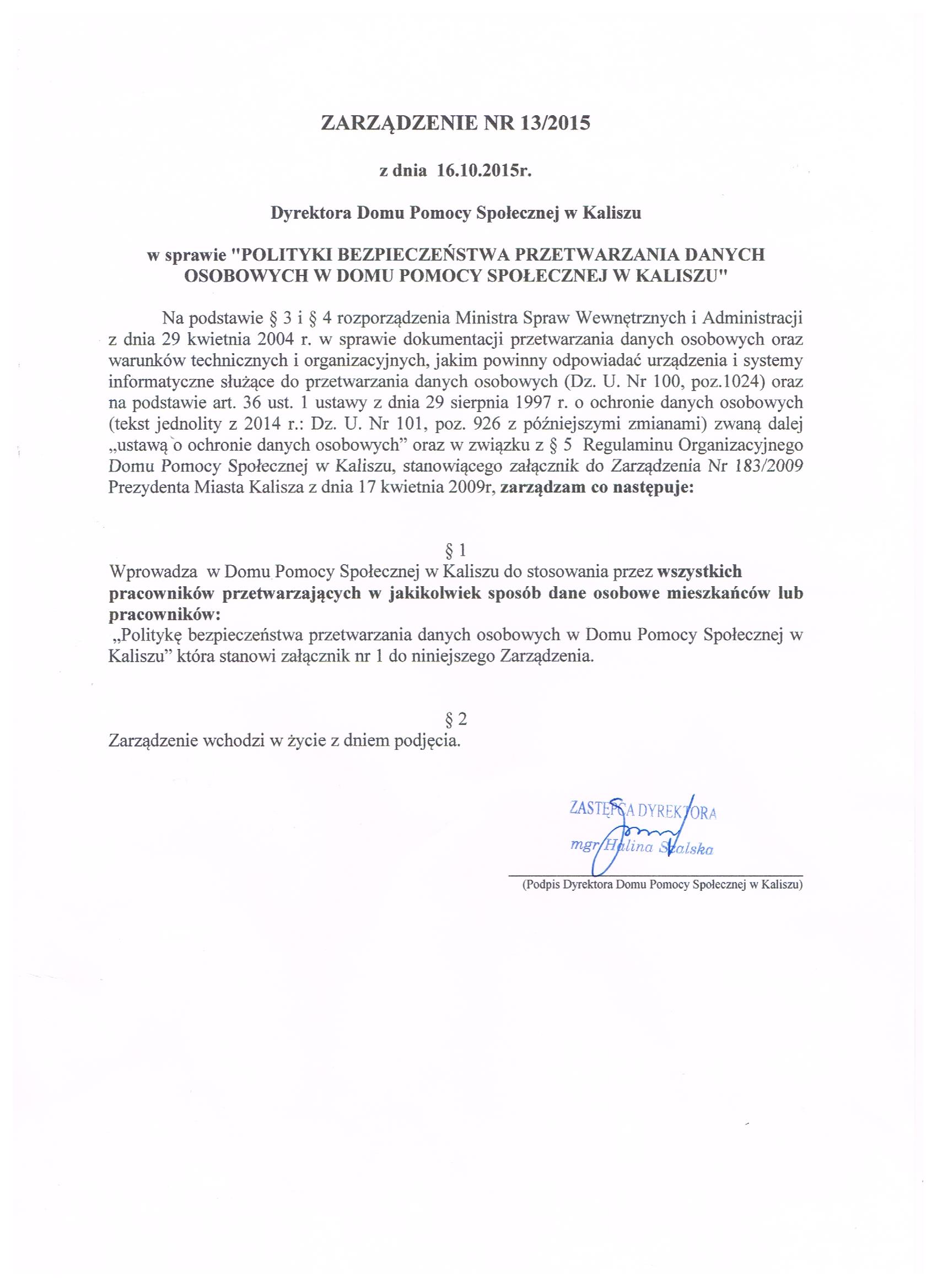 Zarządzenie Nr 13/2015 Dyrektora Domu Pomocy Społecznej w Kaliszu z dnia 16.10.2015r w sprawie "Polityki bezpieczeństwa przetwarzania danych osobowych w Domu Pomocy Społecznej w Kaliszu"