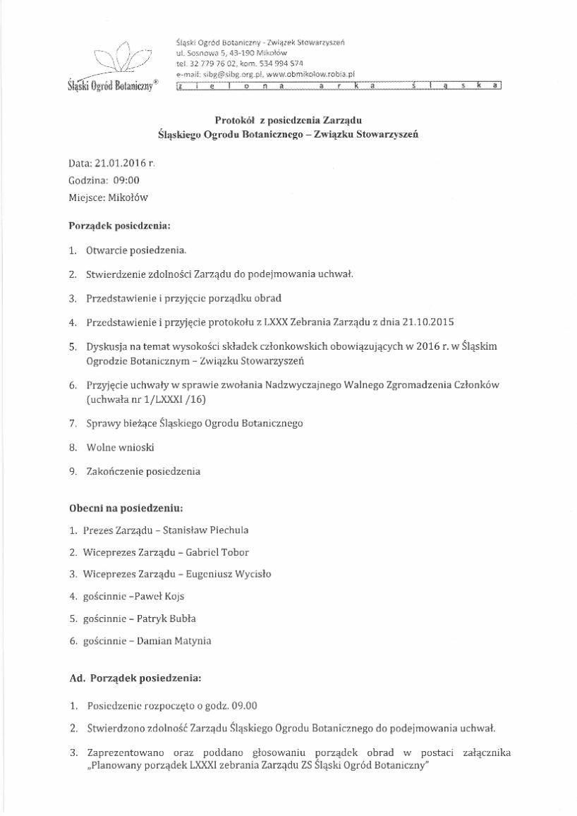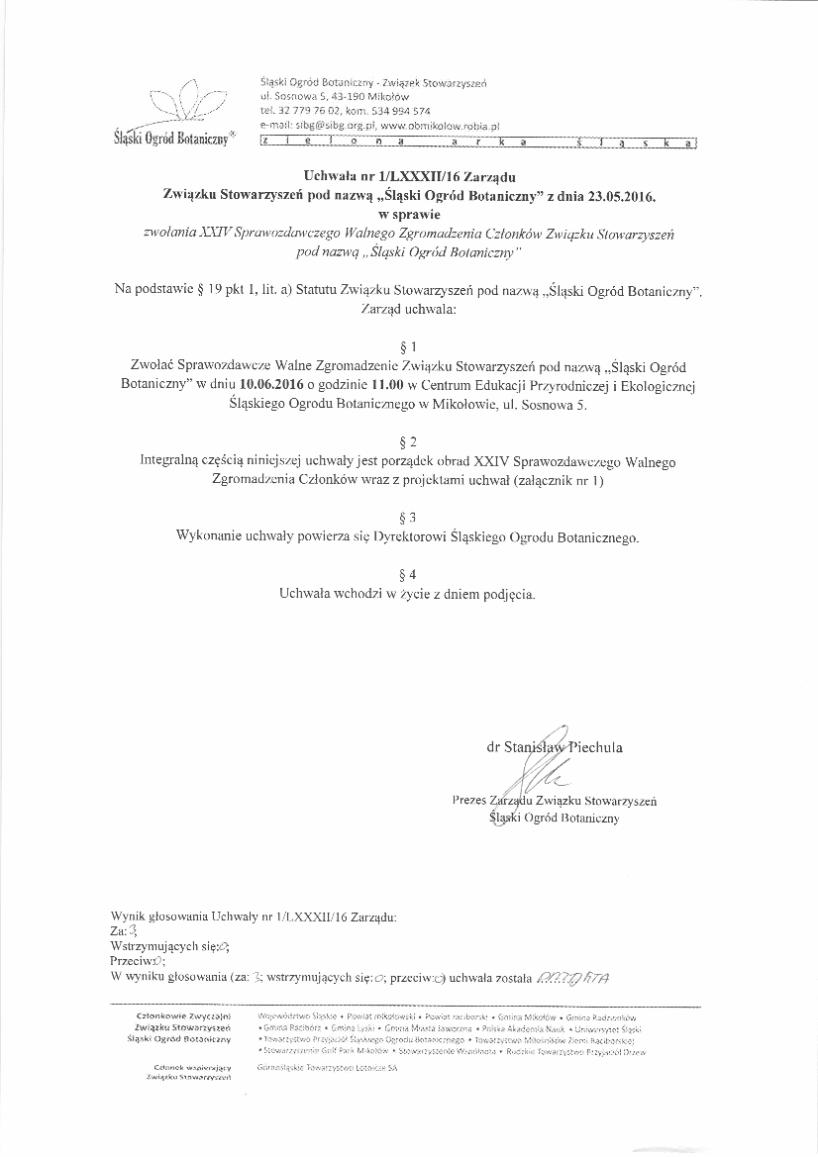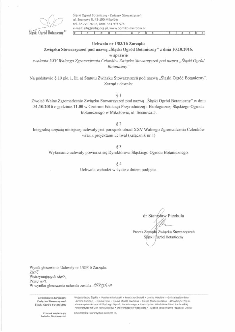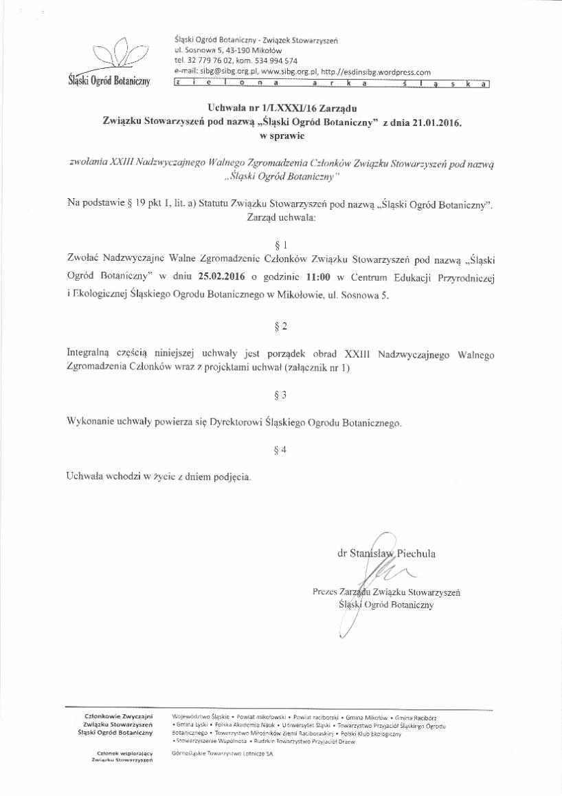 Dokumenty z XXVI Nadzwyczajnego Walnego Zgromadzenia Członków Związku Stowarzyszeń Śląski Ogród Botaniczny (30.01.2017)