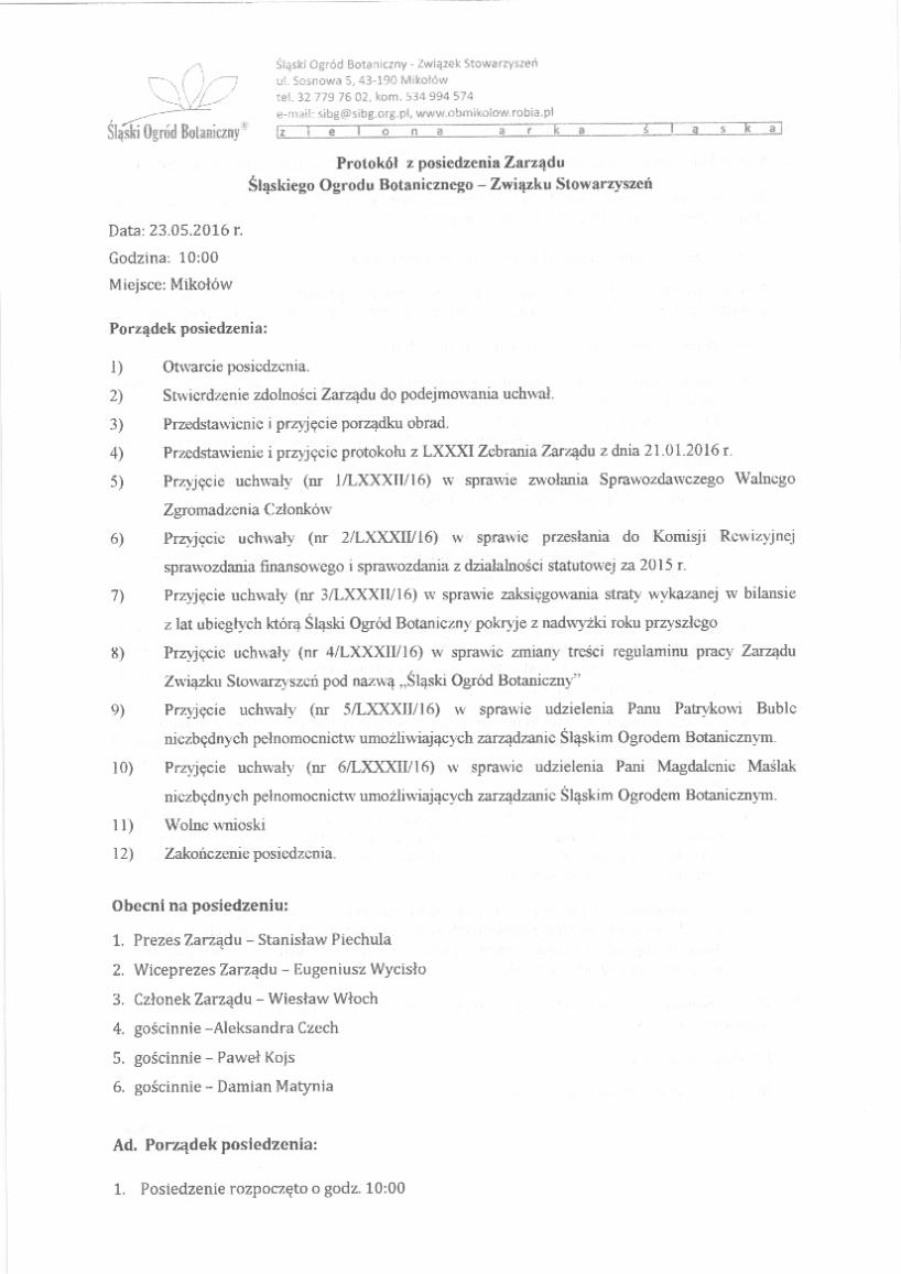 Uchwały i protokoły z posiedzenia zarządu w dniu 23.05.2016 r.