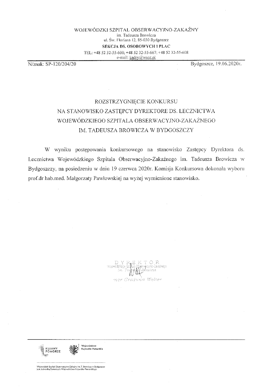 im. Tadeusza Browicza w Bydgoszczy, ul. Św. Floriana 12, 85-030 Bydgoszcz, lub złożyć osobiście w Sekretariacie Szpitala, budynek C, IIp. Na kopercie kandydat jest zobowiązany umieścić adnotację o treści: „Konkurs na stanowisko Naczelnej Pielęgniarki”. Nie otwierać. Oferty powinny być kierowane są do Dyrektora Szpitala. Dodatkowe informacje można uzyskać pod numerem tel.52 32- 55-667. O terminie rozmowy kwalifikacyjnej kandydaci zostaną powiadomieni indywidualnie. Materiały informacyjne o stanie prawnym, organizacyjnym i ekonomicznym Wojewódzkiego Szpitala Obserwacyjno-Zakaźnego im. Tadeusza Browicza w Bydgoszczy można uzyskać w godzinach pracy od poniedziałku do piątku od godz. 7:000 do 14:35.